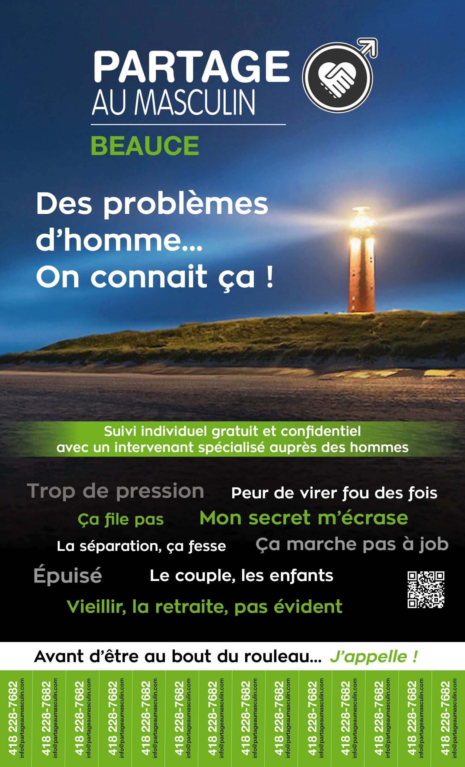 Si vous voulez des dépliants et/ou des affiches pour votre établissement, simplement nous contacter au 418-228-7682 ou au info@partageaumasculin.com